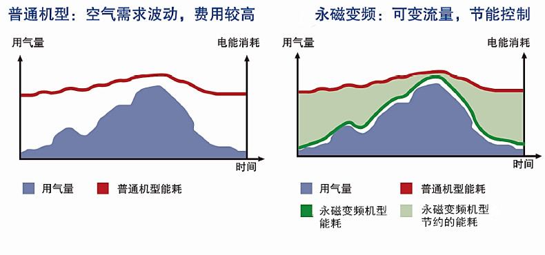 永磁变频空压机可以精确的满足用户的空气需求。当用户的用气量降低时,排气量相应地减少,同时能耗也按比例下降。通过先进的变频技术,大大的减少了空压机的卸载,使能耗大大下降。永磁变频空压机可跟踪空气需求量的变化自动调节电机转速,平均节能可达50%。